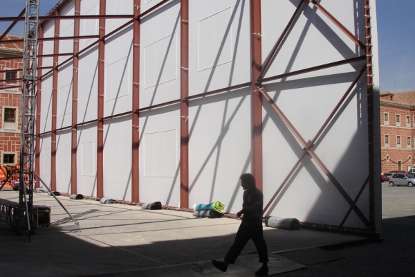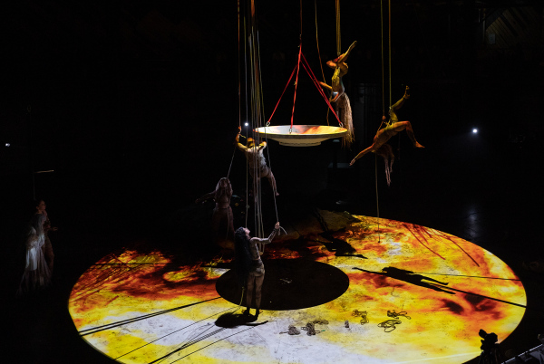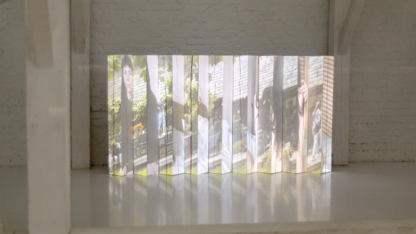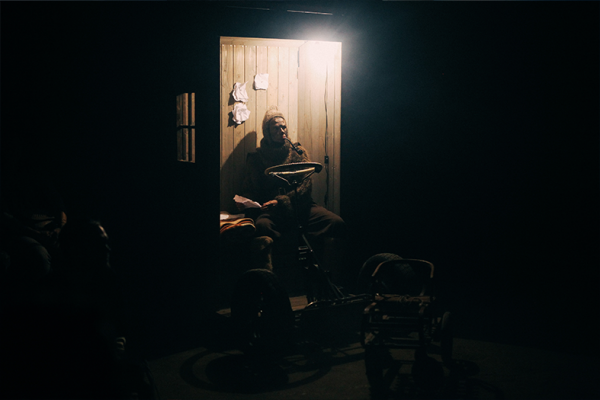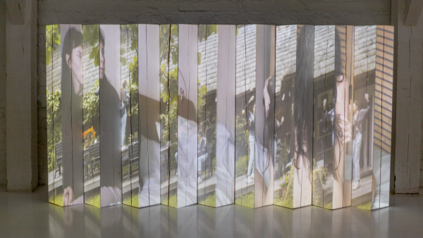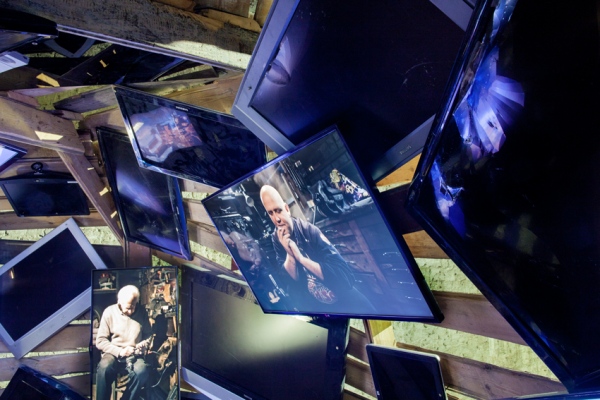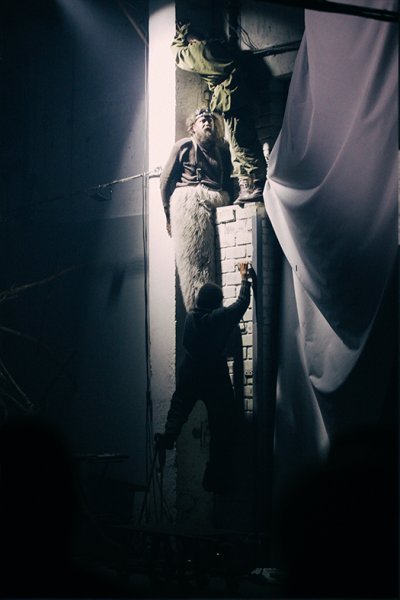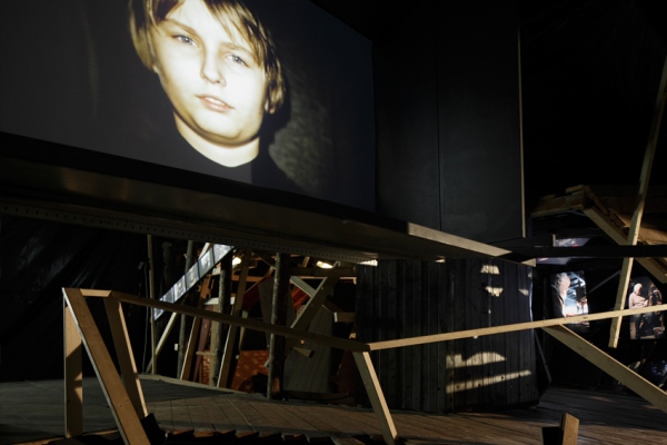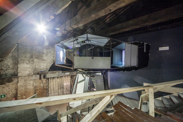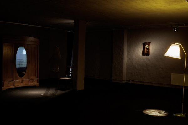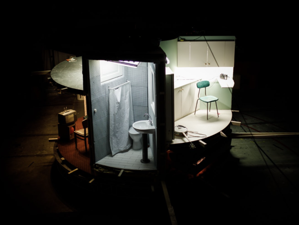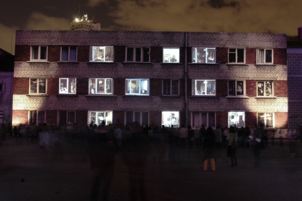 The performance takes place in an installation that takes the form of a giant cut-out property, a giant dollhouse, which gives the audience insight into different rooms - a living room, a kitchen, etc. - but also secret rooms.
