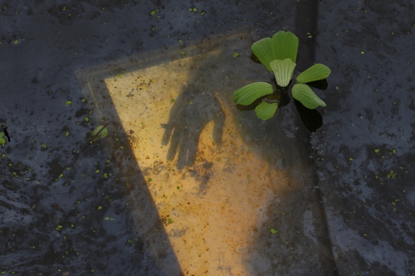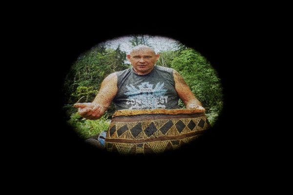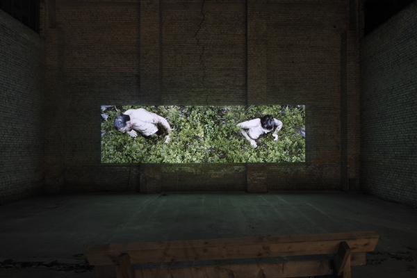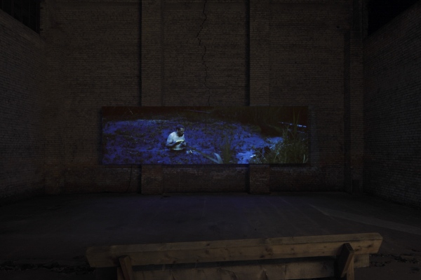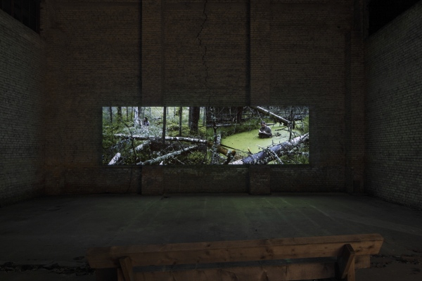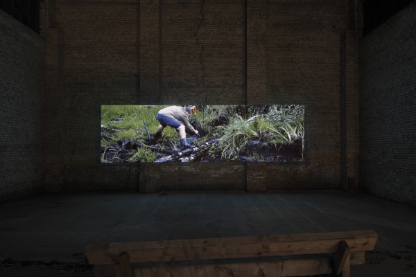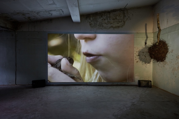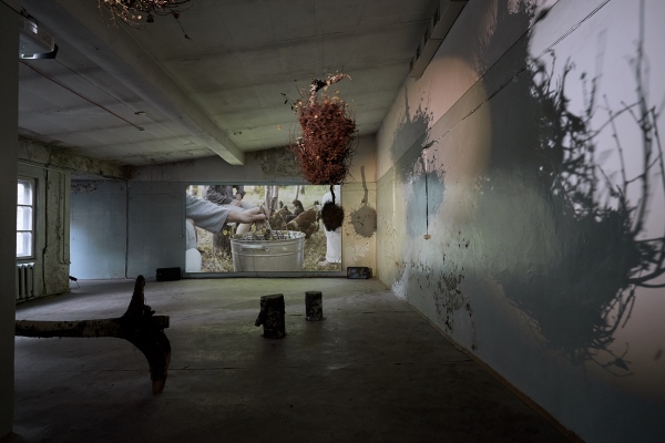 Two-channel video-work consist of a material that has been filmed during the summer of 2017 spent in Drusti – the place owned by the family in the countryside of Latvia. That’s the same place where Eglītis has been painting his so called “earth-works” for around ten years now combining the soil, sand and clay he has obtained on site with acrylic and oil paint. The video and the paintings tell a story about a tribe-like co-existence, on every-day life and living together, on the impossibility being completely “natural”. Three re-appearing characters – Katrīna, Andris and with their four-year-old son – performs various activities that might appear irrational, but within the pace of the video that has sound by Canadian electronic music producer Richard Hawtin aka Plastikman, they suddenly seem like the most natural thing to do in order to survive in the wilderness. An Adam-and-Eve-like couple explores their imperceptible surroundings letting the viewer come face to face with the unbearable ease of existence. Documental fragments of making dinner on an open fire and exhuming beaver’s dam mixed with very eye-pleasing scenes from the marshy corners of the forest and birds flying above the tree tops and oil and plastic pollution floating along the stream of a brook captures a portrait of three people that has so to say “returned to the roots”. It makes us think about the meaning of the term “natural state of being” and human of today and helps us grasp the true worth of being only remotely subjected by relentlessness of the nature and affected by its manifestations in a form of a heavy rain, a storm or a drought.