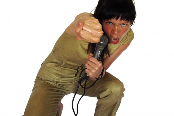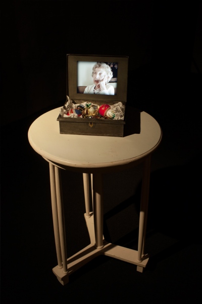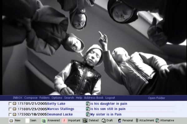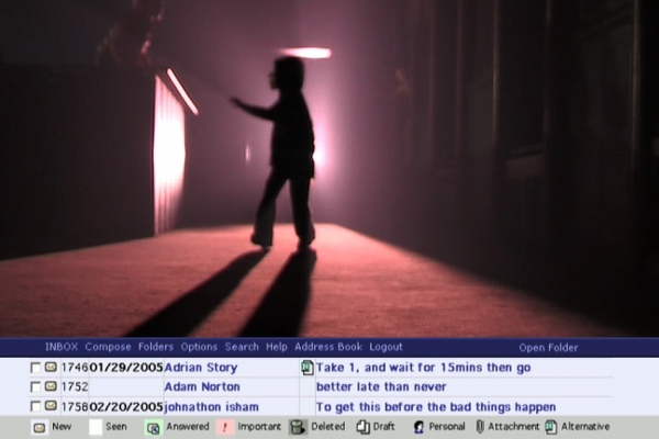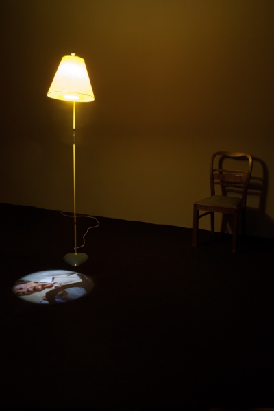 Katrīna's installation consists of two seemingly separate parts ― the active digital medium and the passive role played by the viewer. A loop of an endless song with lyrics put together from bits of spam mail texts, performed by the author, on the monitor; a printer connected to a computer producing printouts of fresh spam mail, a lit reading-lamp, frozen masks of the author's face ― exactly like the ones used by the characters in the video ― on the wall. There's a lot of everything. And yet these elements, including the viewer, are parts of a unified system, a single show.