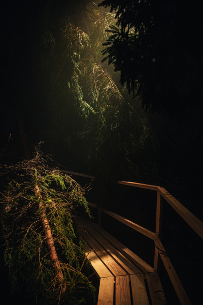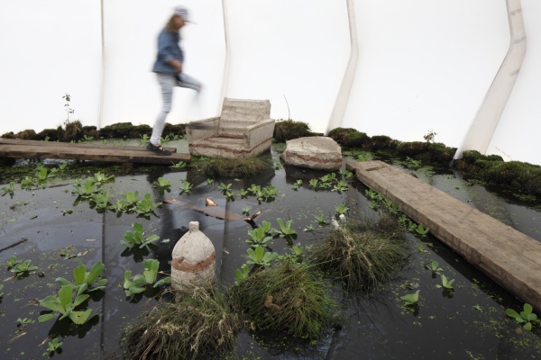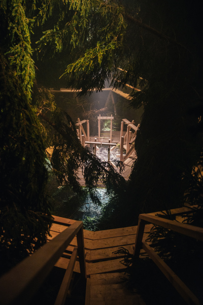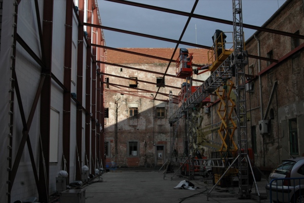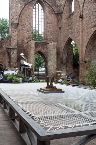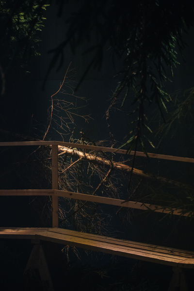 The Nest (Ligzda) consists of materials that are readily available in the city and which a person who has gone for a walk and wants to make a nest can easily stumble upon: tram rails, trolley-bus wires and horns, uprooted trees, street lights and power poles. Inside the nest, however, there will be a swamp, a bottomless wetland: intimate, dangerous, mystical, full of will-o’-the-wisps, drowned armies, rocks and other objects.