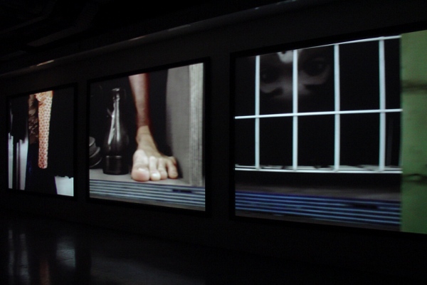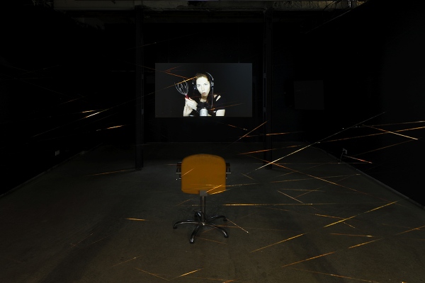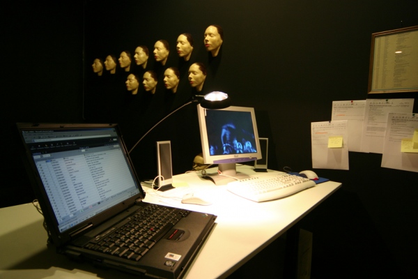 The structure of the work is hinged on the juxtaposition of the active, living and efficient digital medium and the numb and "dead" real world, the viewer's space. His/hers is only to see and hear. Even the computer is completely non-interactive, it's a programme the viewer is unable to adjust in any way. The key actors are the video and the set... The video is a story within a story. Blind, dancing masks. Responses provoked by human actions. Things and processes that can't be changed anymore. Everything is completely irreversible. There is no way of going back and retracting what was once committed. The consequences of your actions ― you either live with them or... The spectator becomes the guilty party. The recurrent spam printouts are a constant reminder of that. The mute masks on the wall, the inability to exert any influence on anything. Except by destroying. The song and the video are like a promise of escape. You'll only have to watch. You'll only have to listen. And yet even that is but a futile illusion. Even though you have paid your entrance fee to this art show.